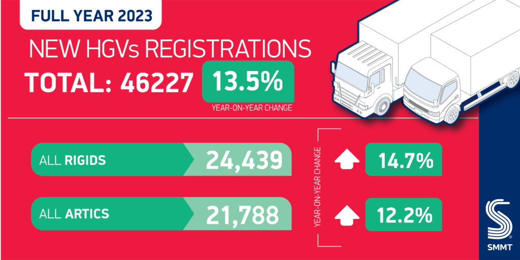 - UK’s new truck market grows for second consecutive year, up 13.5% to 46,227 units in 2023 – the best performance since 2019.
