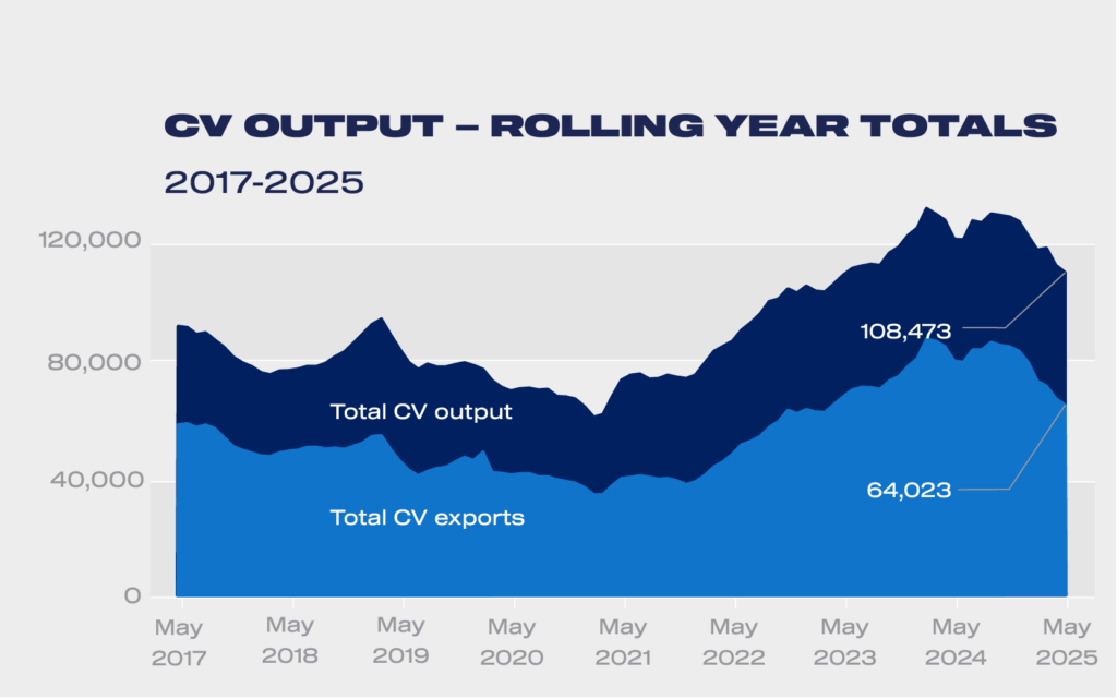 UK car and commercial vehicle production fell for the fifth consecutive month in May, down -32.8% to 49,810 units, according to the latest figures published today by the Society of Motor Manufacturers and Traders (SMMT). Excluding 2020, when Covid lockdowns saw factories shuttered or running at greatly reduced capacity, it was the lowest performance for the month since 1949.1 Year to date, total output is down -12.9% on 2024, to 348,226, the lowest since 1953.2